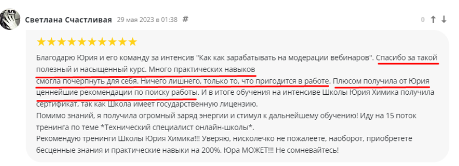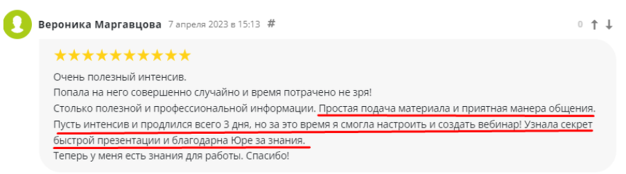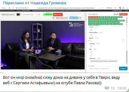 Это мой пошаговый курс, который уже прошли 108 человек и большая часть из них начали зарабатывать на модерации и настройках вебинаров для успешных онлайн-школ.